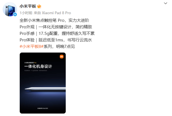 【CNMO科技消息】小米17系列新品发布会将于9月25日19点举办国融资管,发布会上将带来小米17系列、小米平板8系列国融资管以及配套的小米焦点触控笔Pro等新品。9月24日,小米官方对小米焦点触控笔Pro进行了预热。