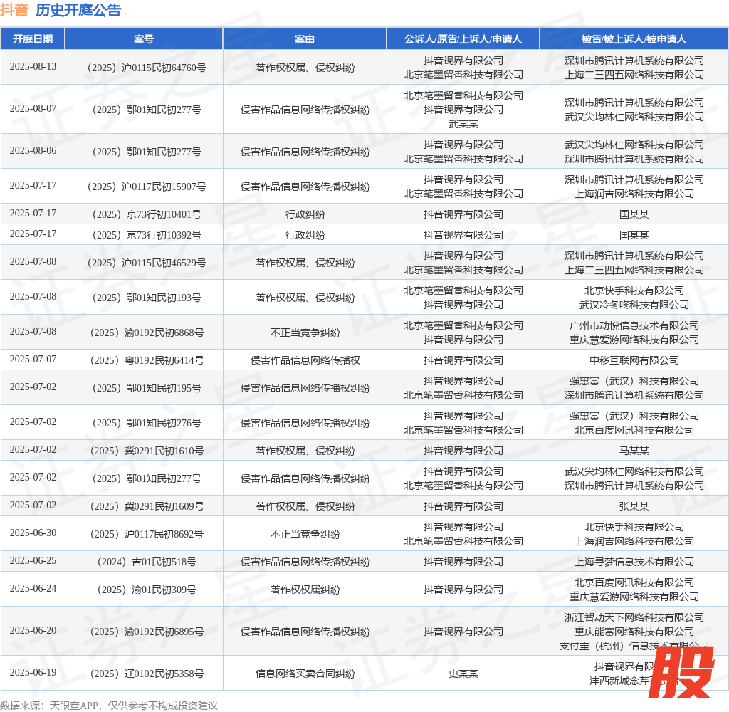 案号:(2025)渝0192民初6895号审理法院:重庆两江新区人民法院(重庆自由贸易试验区人民法院)案由:侵害作品信息网络传播权纠纷当事人信息: 原告/上诉人:抖音视界有限公司 被告/被上诉人:浙江智动天下网络科技有限公司、重庆能富网络科技有限公司、支付宝(杭州)信息技术有限公司开庭日期:2025年6月20日根据统计,近一年内以抖音视界有限公司为当事人的历史开庭公告有86则,其中案由为“侵害作品信息网络传播权纠纷”的公告以37则居首,其次为“著作权权属、侵权纠纷”有27则,“侵害商标权纠纷”有6则。历史开庭公告(前20条)如下: